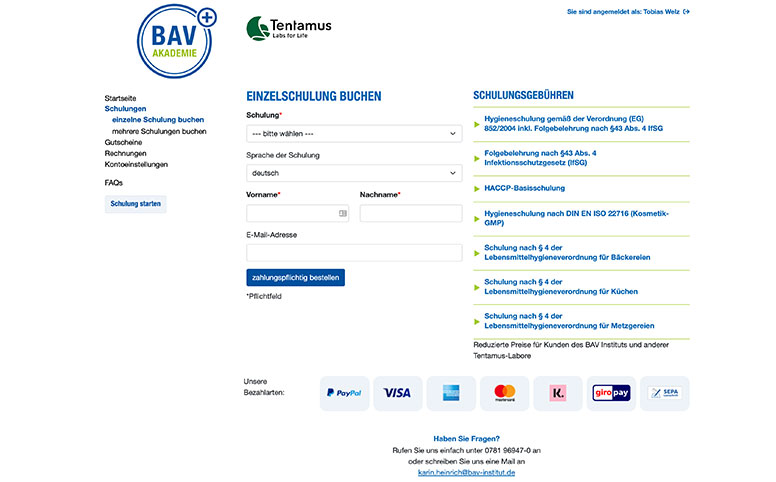 After logging into your account, you can directly book a training. Fill in the fields and select the payment method. You can find the booked training with the participant name and the corresponding access data under the training administration (see under the FAQ item "Where can I find the access data...").
