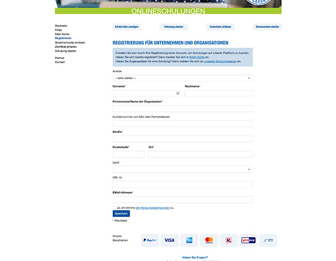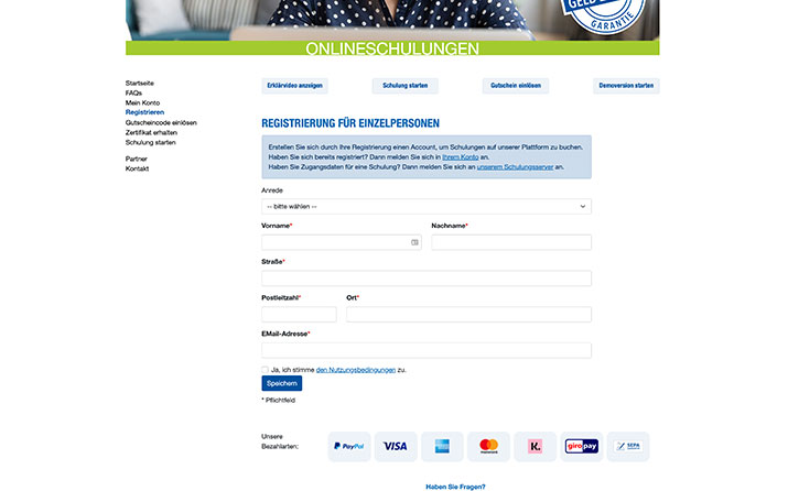 Nach der Anmeldung in Ihrem Konto können Sie direkt eine Schulung buchen. Füllen Sie die Felder aus und wählen die Bezahlungsart. Die gebuchte Schulung mit dem Teilnehmernamen und die zugehörigen Zugangsdaten finden Sie unter der Schulungsverwaltung (siehe unter dem FAQ-Punkt "Wo finde ich die Zugangsdaten...").