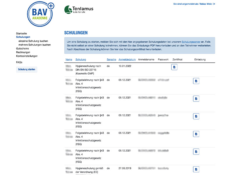 Die individuellen Benutzernamen und Passwörter finden Sie in Ihrem Account bei "Schulungen" unter den einzelnen Namen. Ein Einladungs-PDF mit allen notwendigen Daten steht dort zum Download zur Verfügung.