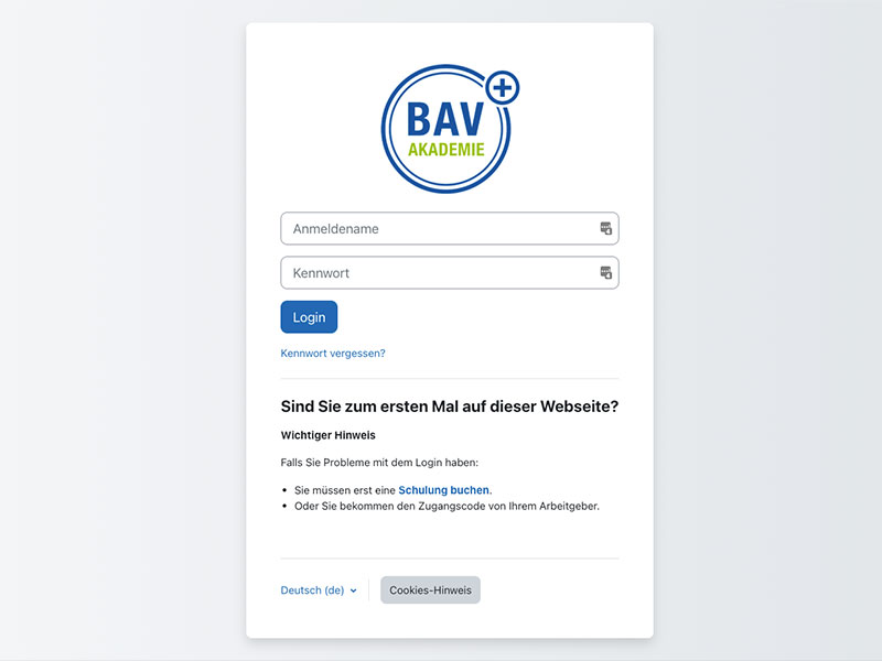 You will find the access data for your training in your account under "booked training" with the invitation PDF. To start this training, log in with these access credentials at https://moodle.bav-onlineschulung.de/.